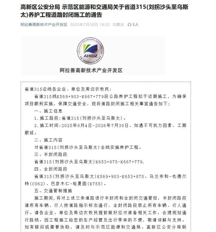 极目新闻记者查询了解到,2025年7月,阿拉善盟高新技术产业开发区官方微信曾发布《关于省道315(刘拐沙头至乌斯太)养护工程道路封闭施工的通告》,施工时间为2025年8月4日至2026年7月30日,如遇不可抗力因素,工期顺延。施工内容称,对省道315(刘拐沙头至乌斯太)全线实施养护工程,其中半封闭路段为省道315(刘拐沙头至乌斯太)K653+875-K667+779,全封闭路段为省道315(刘拐沙头至乌斯太)K569+903-K653+875、乌兰布和-也德尔特(C062)、巴彦木仁-哈夏图(X755)。