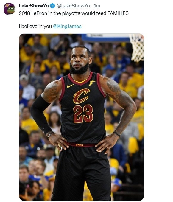 面对困境,湖人自媒体LakeShowYo晒出2018年骑士时期詹姆斯的照片,直言“2018年季后赛里的勒布朗,足以扛起整支球队!我信你”。2018年季后赛,詹姆斯曾以场均34.0分9.1篮板9.0助攻1.4抢断的全能表现,单核带队打进总决赛,超强统治力被球迷称为“灭霸詹”。